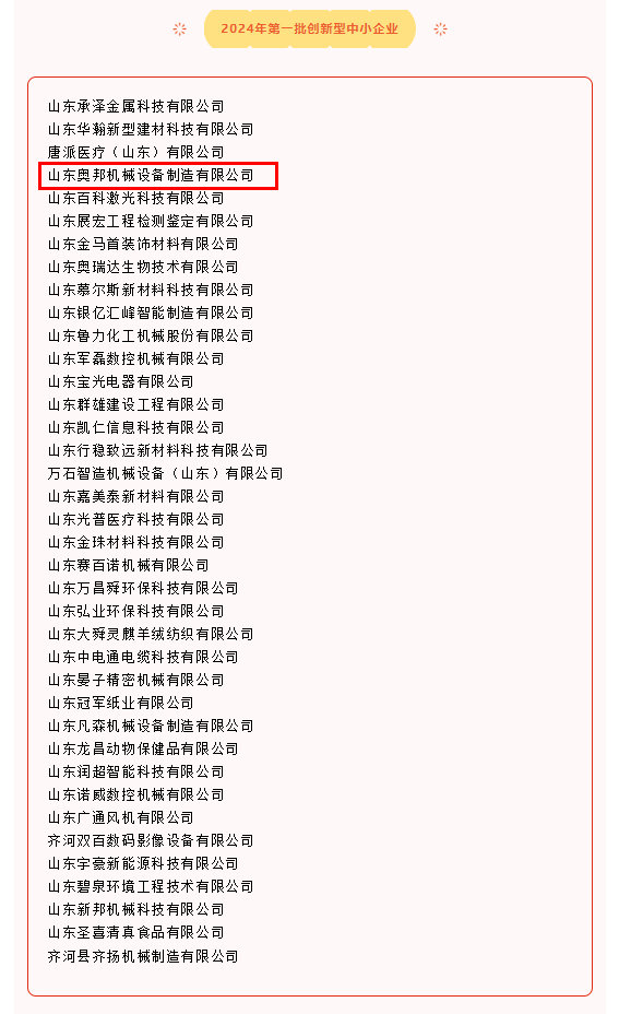 近日,山東省工信廳公布山東省2024年度第一批創(chuàng)新型中小企業(yè)名單,山東奧邦機(jī)械設(shè)備制造有限公司成功上榜!